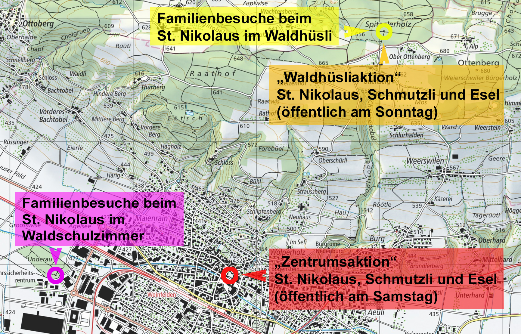 Der Samichlaus und sein Schmutzli können auch am Samstag im Stadtzentrum von Weinfelden oder am Sonntag im Waldhüsli oberhalb von Weinfelden besucht werden. Die «Zentrumsaktion» und die «Waldhüsliaktion» sind öffentlich und es ist keine Anmeldung erforderlich. Bei beiden Aktionen werden der Samichlaus und Schmutzli auch von einem oder zwei Esel begleitet. Sie freuen sich auf Besuche von vielen Kindern und Familien.